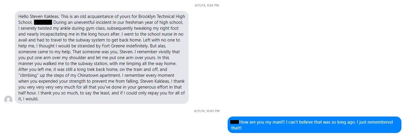 I have a unique story to share. A story I did not remember until someone else reminded me of it. In high school, I noticed a fellow class mate of mine limping. I grabbed a hold of him and helped him along his way for as long as I could. Despite how much time I spent with him, I forgot about it as the months passed. It was instinctual for me to help him out and a normal frame of operation for my life so I didn’t think much of it. It seems though, that the receiver of my help did not forget about it, and he actually surprised me almost ten years later with a Facebook message (after not having said much to each other since that occurrence) telling me how grateful he was for my help and that other people just walked passed him. I can’t tell you how much it blew me away to receive a random note like this. One simple action from my past came full circle to remind me that all we are all nothing but the memories we leave in our wake.